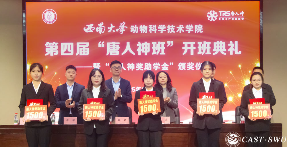 孙海军宣读第四届“唐人神班”学员名单。第四届“唐人神班”学员代表王振荣在发言中以“感激与责任”表达心声,代表全体学员立下“潜心求学、精诚团结、勇于实践”的誓言,表达了新时代农科学子扎根产业、服务“三农”的坚定志向与决心。陈佩宣读“2024-2025学年唐人神奖助学金”获奖名单,主席台就座的领导、嘉宾为获奖学生颁发证书,随后为“唐人神班”班主任、班委颁发了聘书。