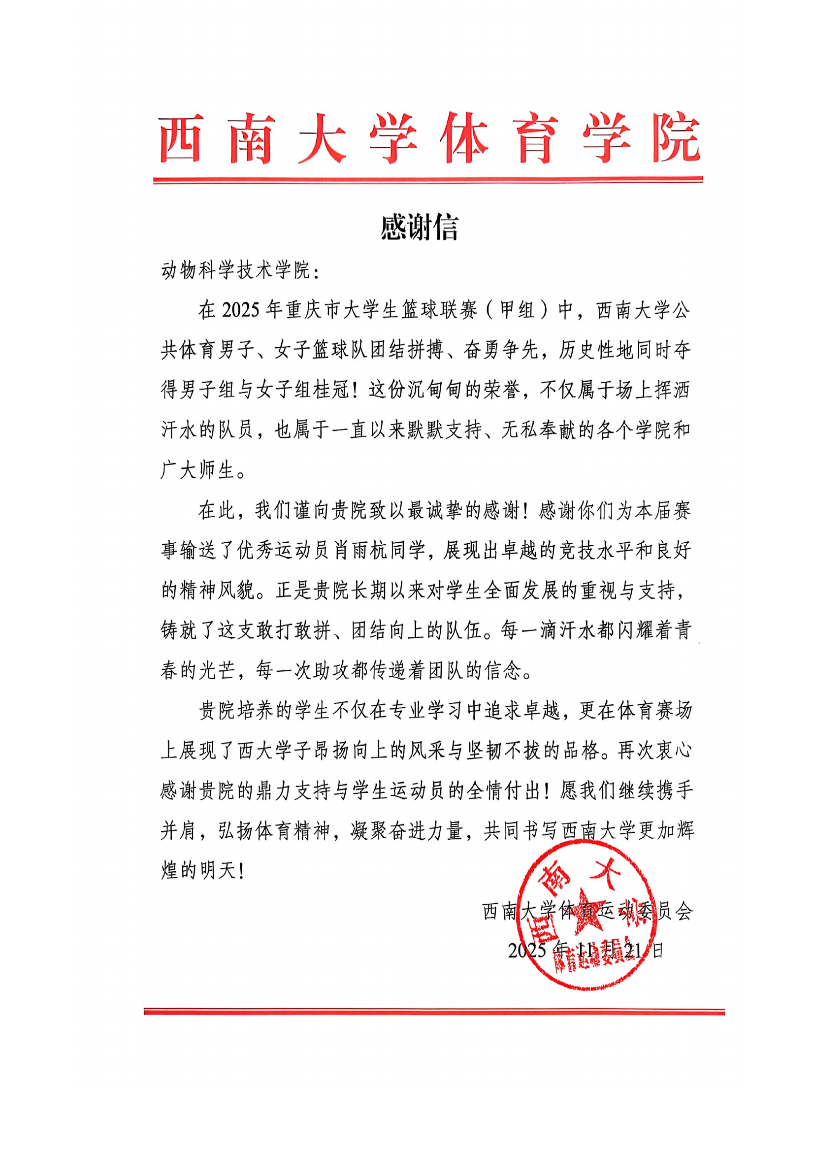 近日,2025年重庆市大学生篮球联赛(甲组)传来捷报,西南大学男女篮双双摘得桂冠,创造历史性佳绩。动物科学技术学院2023级动物科学专业7班本科生肖雨杭,作为学校女篮队员,以稳定发挥和顽强斗志助力女篮夺冠,其展现出的团队协作意识、抗压能力与竞技素养,赢得赛场内外一致赞誉,充分彰显了学院“五育并举、全面发展”的育人成效。