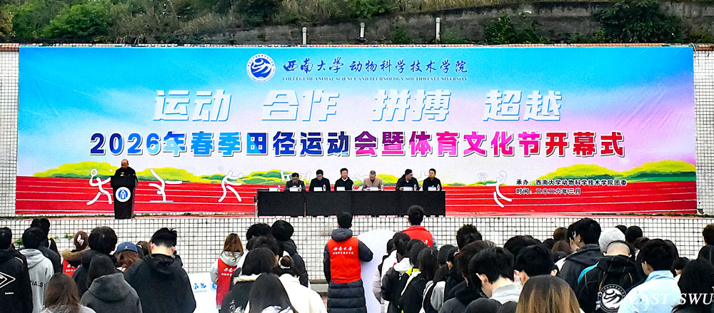 致辞结束后,运动员代表旦真同学、裁判员代表李通同学先后庄严宣誓。运动员代表承诺,将严格遵守比赛规则,尊重对手、尊重裁判,赛出水平、赛出风格,以公平竞技展现青春本色;裁判员代表承诺,将恪守裁判职业道德,秉持公平、公正、公开的原则,认真履行裁判职责,严谨执裁、秉公评判,全力保障赛事有序开展。随后,学院院长赵永聚郑重宣布西南大学动物科学技术学院2026年春季田径运动会暨体育文化节正式开幕。