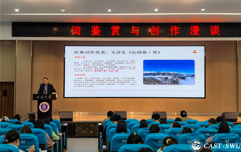 随后,徐晓黎研究员开讲《词鉴赏与创作漫谈》。他以毛泽东《沁园春·雪》、苏轼《水调歌头·明月几时有》等千古绝唱为引,带领同学们沉浸式感受词的意境之美与情感力量;系统梳理了词从隋唐燕乐“曲子词”到宋代“一代文学”的发展脉络,清晰呈现了词从民间质朴到文人雅化、婉约与豪放双峰并峙的演进历程;深度解读了李煜、苏轼、李清照、辛弃疾、纳兰性德等历代词坛大家的代表作,结合词牌格律、创作背景,拆解了词作中形式与内容、个人命运与时代语境的深层关联。在创作实践环节,徐晓黎研究员结合自身原创词作,分享了词的创作核心要点:强调立意要贴合时代、抒写真情实景,格律需严格遵循词牌规范,押韵可择《词林正韵》《中华新韵》等规范韵书,且新旧韵不可混用;同时以王国维“人生三境界”为喻,阐释了填词从“寻觅立意”到“锤炼字句”再到“灵感顿悟”的进阶过程,为同学们提供了可落地的创作方法。整场讲座内容丰富、深入浅出,兼具文学性、思想性与实用性,既带领同学们回溯了千年词史的文化脉络,也为大家打开了词的鉴赏与创作之门。现场师生反响热烈,纷纷表示在经典赏析与创作分享中,深刻感受到了中华古典词韵的独特魅力,进一步提升了传统文化素养与文学审美能力。
